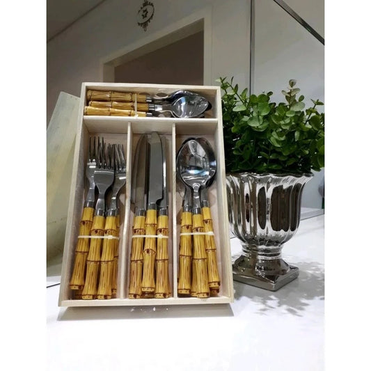 Faqueiro 24 Peças de Inox com Cabo de Bamboo para Uso Diário