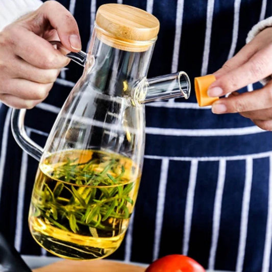 Galheteiro de vidro com tampa de bambu 650ml para azeite e vinagre